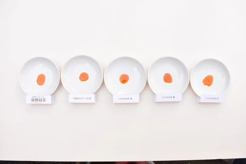 「国産オーガニック発酵緑茶」「プーアル茶」「トクホ緑茶A」「トクホ緑茶B」「トクホブレンド茶C」の5種類のお茶を油にそれぞれ加えて、油の分解具合を比較してみました。