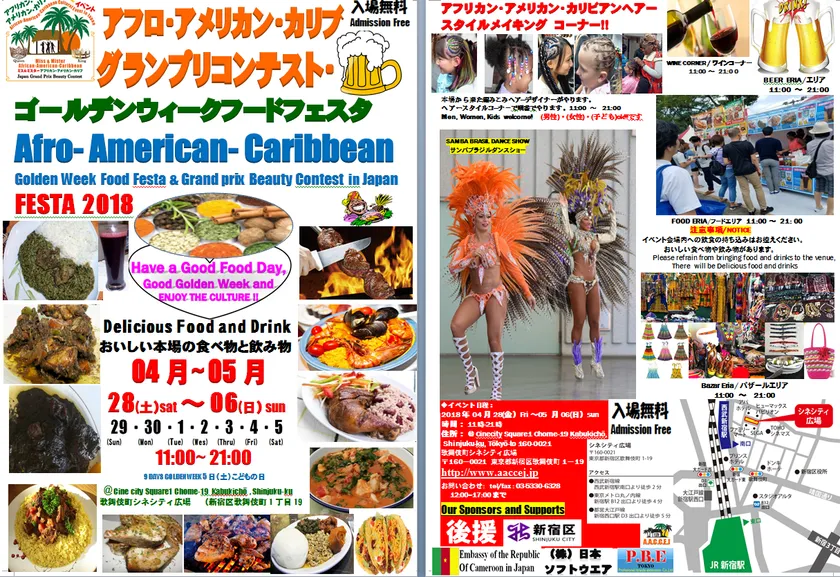 アフロ・アメリカン・カリブフェスタ実行委員会は、2018年4月28日(土)~5月6日(日)の期間に『アフロ・アメリカン・カリブゴールデンウィークフードフェスタ・グランプリ―コンテスト2018』(場所:歌舞伎町シネシティ広場)を開催いたします。