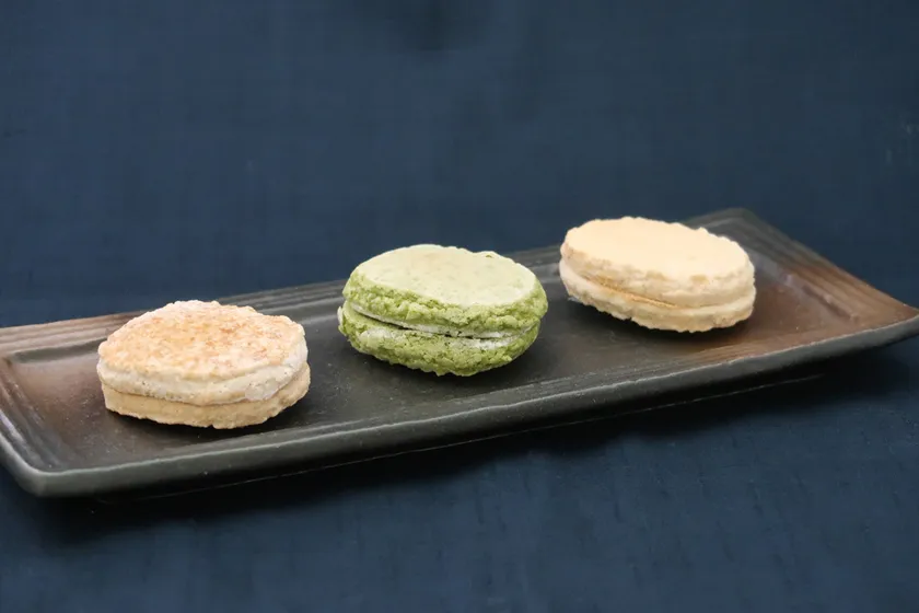ダックワーズ(左から:黒豆きなこ、黒ゴマ抹茶、プレーン)