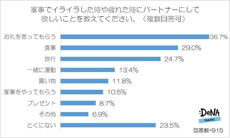 最も多い回答は「お礼を言ってもらう」(36.7%)となりました。以降、「食事」(29.0%)、「旅行」(24.7%)に連れて行くなどが続いています。「プレゼント」(8.7%)は低く、家事のお礼としては「モノ」よりも「コト」が喜ばれる傾向にあるようです。