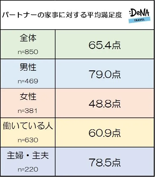 パートナーの家事について100点満点で評価してもらったところ、最低点0点、最高点100点で、全体の平均は65.4点となりました。男女別で見てみると男性79.0点、女性48.8点と大きく差が開く結果となりました。