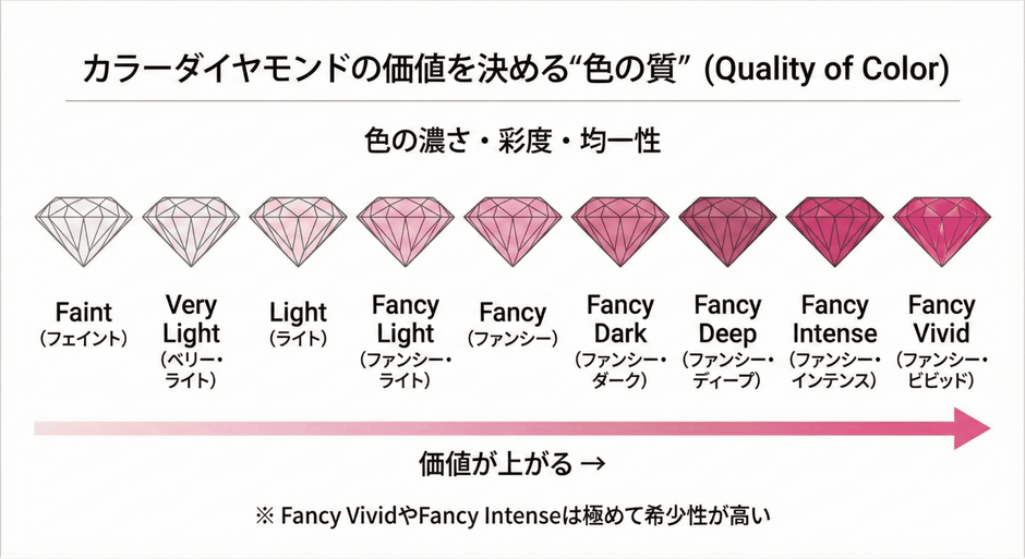 天然の状態で鮮やかな色を持つカラーダイヤモンドほど希少性が高く、その価値は 色の濃さに応じて9段階に分類 されます。