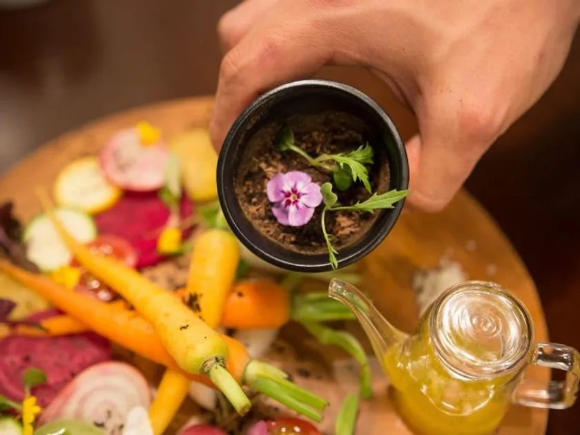前菜には長野県の契約農家を中心に届く鮮やかな春の有機野菜を10種類以上の盛り合わせに。「食べる植木鉢のソース」など3種類の食べ方でお楽しみいただきます。
