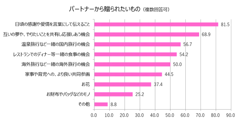 パートナーには、「夢の共有」や「応援」といった、互いの人生で目指すものを共有し、応援しあい、支えあう関係性が求められており、そのようなコミュニケーションや機会の贈り物が喜ばれることが分かりました。