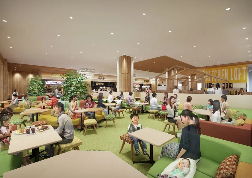 『FUN - FAN!CHOICE!TABLE!』をコンセプトに特色あるゾーニングで楽しめる空間をつくることで、いつでも・どんなシーンでも利用したくなる、地域の皆様のサードプレイスとなるような居心地良いフードコートに生まれ変わります。より多くの方にご利用いただけるよう、席数を32席増やし504席設け、小さなお子様連れの方が利用しやすいよう、ファミリーゾーンには、ベビーを寝かせても安心の奥行きのある低めのソファ席を配置するほか、家族連れに人気のボックス席や子供用手洗いも新設します。 ※店舗の入替はございません。