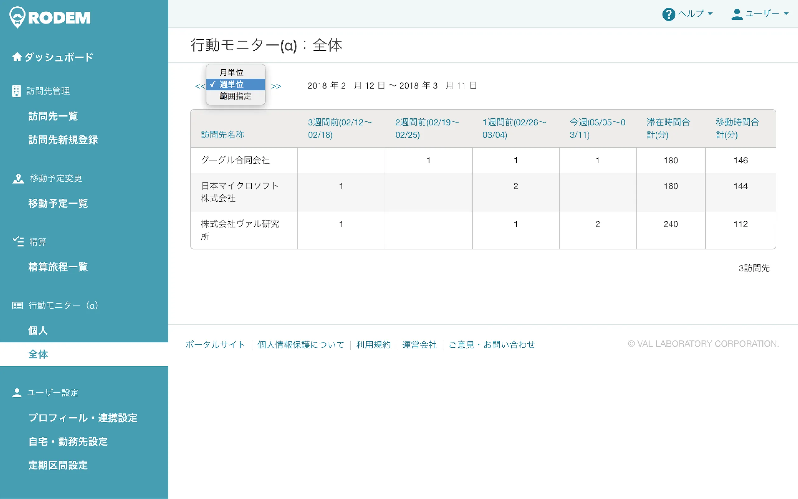 乗り換え案内サービス「駅すぱあと」を提供する株式会社ヴァル研究所(本社:東京都杉並区、代表取締役:太田信夫)は2018年3月13日(火)、スケジュール調整から交通費精算を自動化するビジネス・サポートサービス「RODEM(ロデム)」の新機能として、動的に営業活動を集計・可視化する「行動モニター機能」のα版をリリースします。