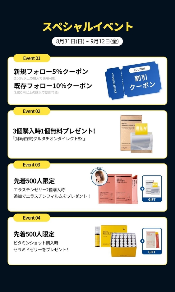 このたび2025年8月31日(日)から9月12日(金)まで開催されるQoo10メガ割ではエラスチンゼリー2箱購入時、エラスチンフィルム追加贈呈のおまけ付きセット、そして、グルタチオン5Xフィルムが3個購入時1個無料で貰えるイベントを開催します。さらにビタミンショット購入時にセラミドゼリーを追加でプレゼントなど、メガ割限定セールやスペシャルイベントを実施いたしますのでこの機会にぜひお得にお試ししてみてください!