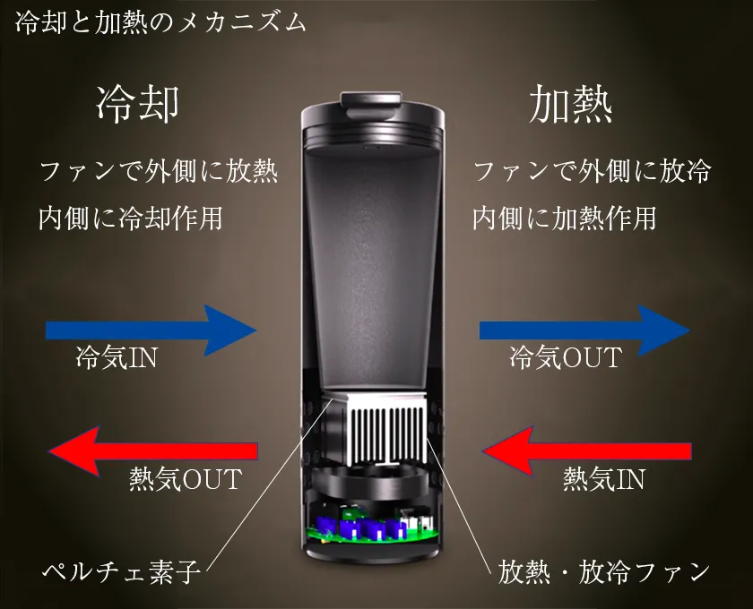 ペルチェ素子とは、2種類の金属を合わせたもので、その接合部分に電気を流すと一方の金属で吸熱が起こり冷やされ、もう片方は発熱して温められます。
