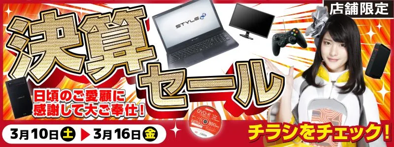 株式会社ユニットコム(代表取締役:端田 泰三、本社:大阪市浪速区)は、全国のパソコン工房およびグッドウィル店舗にて、3月10日(土) からも引き続き「決算セール」を開催しております。日頃のご愛顧に感謝して大ご奉仕! 3月10日(土)・11日(日)限定の特価品もご用意しています。