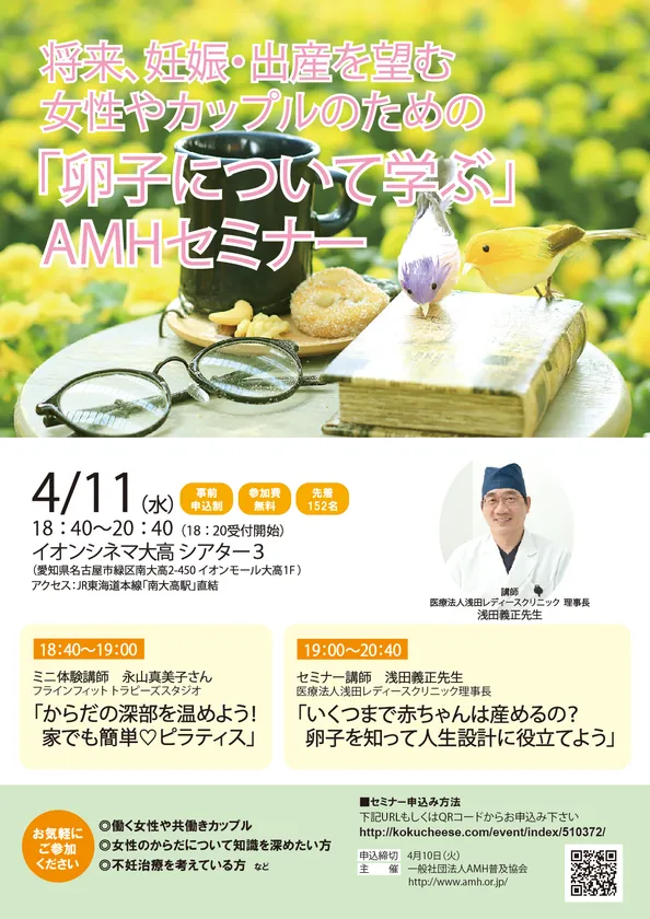 一般社団法人AMH普及協会(本社:名古屋市中村区、代表理事:衣川 智樹)は、妊娠についての正しい知識をわかりやすく解説する『将来、妊娠・出産を望む女性やカップルのための「卵子について学ぶ」AMHセミナー』を、2018年4月11日にイオンシネマ大高で開催いたいます。