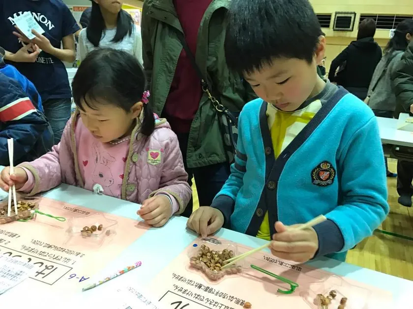お箸でそろばん珠をつかむゲームは参加者に大人気!