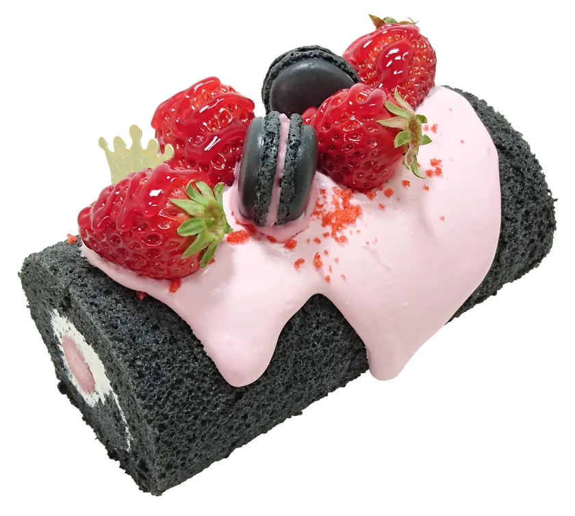 炭の黒が苺の赤を引き立て、見た目に美しいロールです。