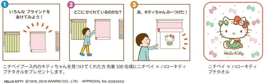 ニチベイブースに隠れているハローキティを見つけていただいた方「先着500名様」に「ニチベイオリジナル ハローキティ プチタオル」をプレゼント。さらにブース内では当社の安心・安全シンボルキャラクター、ハローキティと一緒に写真が撮れる撮影会と、ハローキティによる商品紹介タイムを実施します。