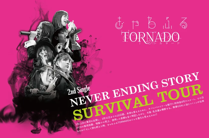 内容は3月9日(金)に全国発売された、きゃわふるTORNADOの2nd Single「NEVER ENDING STORY」。このシングルを携えて、3月11日(日)~3月31日(土)までの20日間、所持金0円からスタートし、売上の50%を生活費として全ての金額を明記しながらGOALを目指すというもの。
