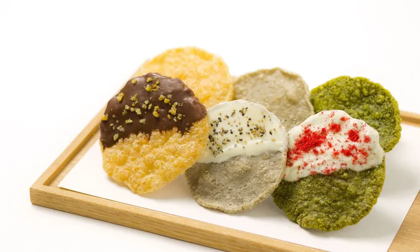 おせんべいの半分(180°)に、チョコやチーズを付けたプレミアムなおせんべいです。一八〇°のコンセプトは“ごちそうをあげたい”。チョコやチーズを付ける工程や、オレンジピールなどのトッピングも全て手作業で、1枚1枚丁寧に仕上げています。限定ふらいどを開発した担当者は、30~40代の女性に喜ばれるような色合いや味わいをイメージしてレシピをつくりました。