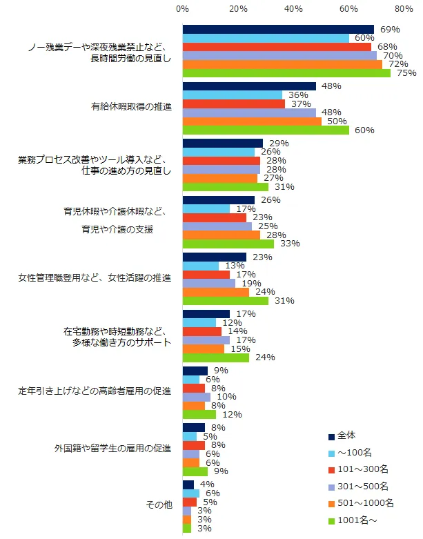 「自社が働き方改革に取り組んでいる」と回答した方に、具体的な取り組みを質問しました。第1位は「ノー残業デーや深夜残業禁止など、長時間労働の見直し」(69%)、第2位は「有給休暇取得の推進」(48%)、第3位は「業務プロセス改善やツール導入など、仕事の進め方の見直し」(29%)でした。規模別で取組比率にギャップが見られた項目は「有給休暇取得の推進」や「女性管理職登用など、女性活躍の推進」です。