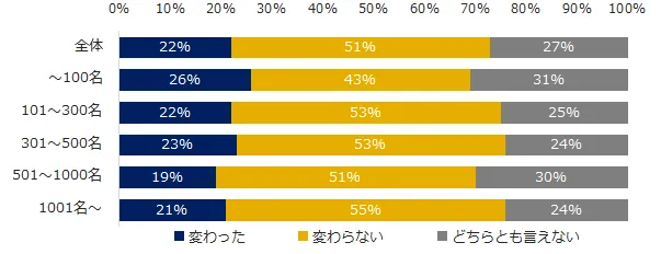 「会社の働き方改革に対する取り組みで、あなたの働き方は変わりましたか?」と伺うと「変わった」が22%、「変わらない」が51%という結果になりました。企業規模別の大きな差異は見られませんでした。