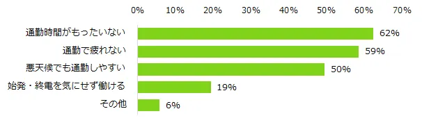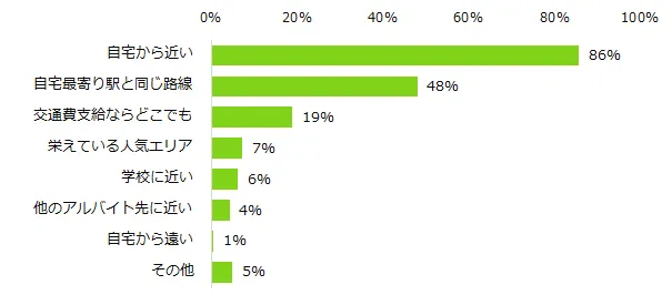 アルバイト先に「自宅から近い」ことを希望する理由は、第1位「通勤時間がもったいない」(62%)、第2位「通勤で疲れない」(59%)、第3位「悪天候でも通勤しやすい」(50%)が並びました。