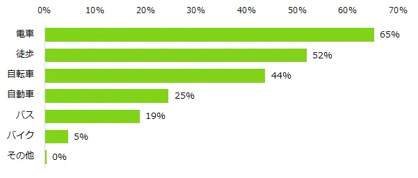 勤務地で希望する条件は「自宅から近い」(86%)、「自宅最寄り駅と同じ路線」(48%)。自宅からの通勤時間は「16~30分」を希望する方が52%で最多、通勤手段は「電車」(65%)「徒歩」(52%)をともに半数以上の方が希望する結果となりました。自宅からの距離を重要視していることがうかがえます。