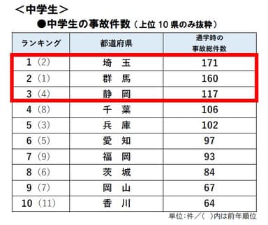 ●中学生事故件数ワースト1位 埼玉、2位 群馬、3位 静岡