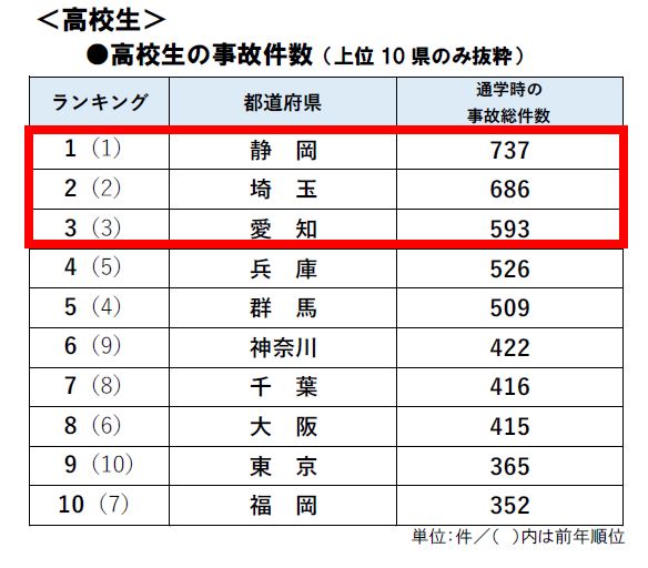 ● 高校生事故発生件数ワースト1位 静岡、2位 埼玉、3位 愛知