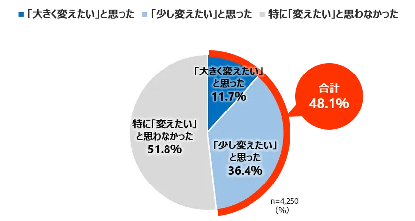 2017年春に生活・職場環境の変化があった20-30代女性のうち、約半数の48.1%が「メイクを変えたいと思った」と回答しています。また、11.7%の人は、「大きく変えたいと思った」と回答しています。生活環境や働く環境が変わることで、心機一転しメイクも変えてみようと感じる女性が多いことが伺えます。