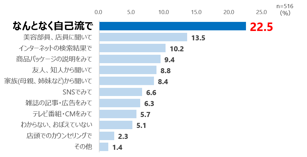 メイク落としの方法を学んだ最初のきっかけについて聞いた結果、「なんとなく自己流」が1位。2位以下と大きな差が開く結果になっています。上述の「メイク落とし時間が短い方が多い」という結果は、正しいクレンジング方法を教わらず、自己流で行っている人が多いからなのかもしれません。