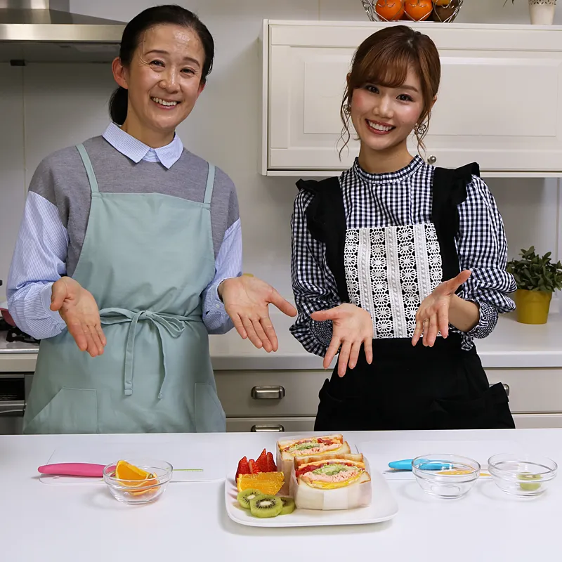 「カララフル☆クッキング かんたん楽しく!」は、子育て中のママさんにおすすめの簡単にできるお料理を紹介する情報番組です。番組では、ママさんYouTuberとして活躍中の「ほしのこCH」さんとフードコーディネータの福留さんが、セラフォートフライパンやキャベツの千切が簡単にできるワイドピーラーなど京セラのキッチングッズを使い、色とりどりの食材で、栄養満点、ボリュームたっぷりのサンドイッチを作ります。