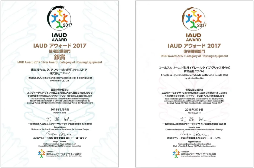 株式会社ニチベイ(本社:東京都中央区、社長:福岡 勇之輔)は、一般財団法人 国際ユニヴァーサルデザイン協議会(IAUD)が主催するIAUDアウォード2017にて、ユニヴァーサルデザインドア「プッシルドア」「プッシルドアライト」が銀賞を受賞、さらに高遮光ロールスクリーン「ソフィー」小型ガイドレールタイプ グリップ式もIAUDアウォードを受賞いたしました。