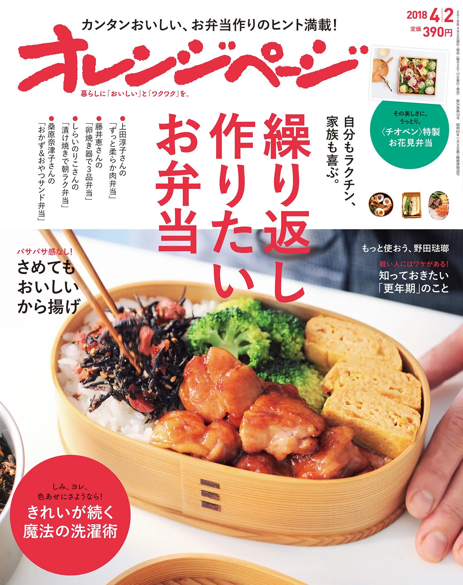 株式会社オレンジページ(東京都港区)が、月2回発行する生活情報誌『オレンジページ』。3月17日(土)発売の『オレンジページ4/2号』は、「自分もラクチン、家族も喜ぶ」お弁当特集号。〈チオベン〉特製お花見弁当や、4人の料理家が作り続けてきたお弁当、そのおいしさの秘密に迫ります。