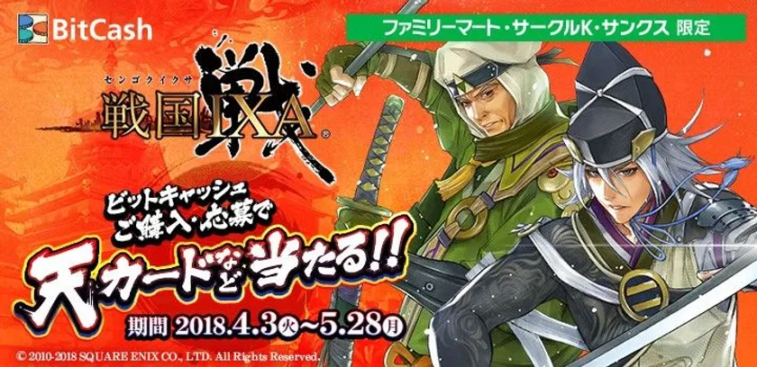 電子マネー「ビットキャッシュ」の発行元であるビットキャッシュ株式会社(本社:東京都渋谷区、代表取締役社長:伊草 雅幸)は、株式会社スクウェア・エニックス(本社:東京都新宿区、代表取締役社長:松田 洋祐)が提供する『戦国IXA』のゲーム内アイテムがもれなくもらえる「ビットキャッシュで『戦国IXA』のアイテムGETキャンペーン」を2018年4月3日(火)より開催します。