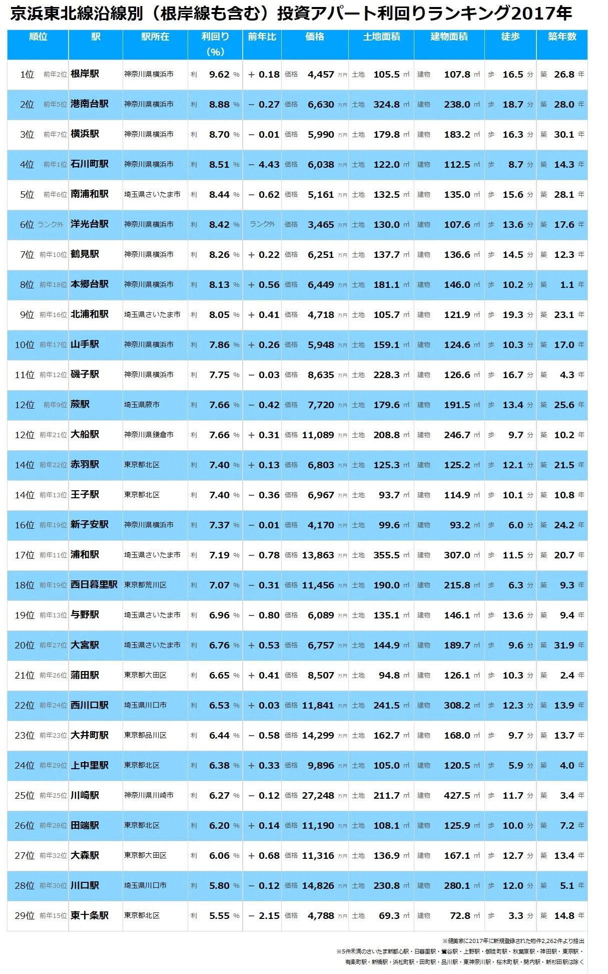 不動産投資と収益物件の情報サイト「 健美家( けんびや ) 」を運営する健美家株式会社( 本社:東京都港区、代表取締役社長:倉内敬一 )では、同サイトに登録された新規物件を集計し、「 京浜東北線沿線駅別アパート投資利回りの平均 」の調査結果をまとめましたのでお知らせいたします。