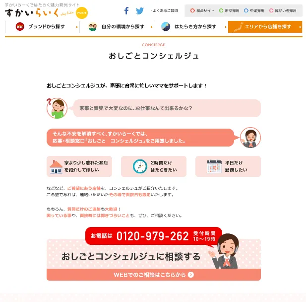 株式会社すかいらーく(本社・東京都武蔵野市、代表取締役社長兼CEO・谷 真、東証一部:証券コード3197)は、このたび、働くママの応募者様の不安を解消するため、さまざまな相談・応募に対応する『おしごとコンシェルジュ』のサービスをすかいらーく応募受付センター内に新設しました。