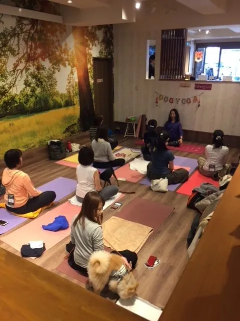参加者の様子:愛犬と一緒にポーズを取るということで、ゆっくりと時間をかけて愛犬と一緒に呼吸を合わせていました。最初は落ち着きなく動き回っていたり、キョロキョロと辺りを見回したりしていた子も、時間が経つにつれてリラックスしてきた様子でした。最後は飼い主さんに抱かれて一緒にポーズを決めるなど、愛犬との絆が深まったようでした。参加者は、「リラックスできた」とか「自分ひとりでするヨガと違う楽しさがあった」など満足そうでした。