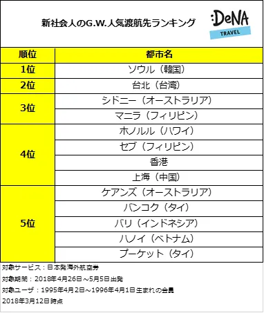 ~DeNAトラベルが新社会人のG.W.人気渡航先ランキングを発表~