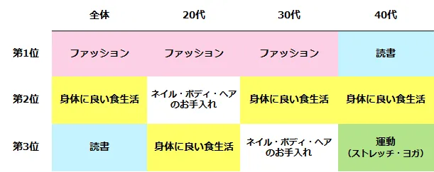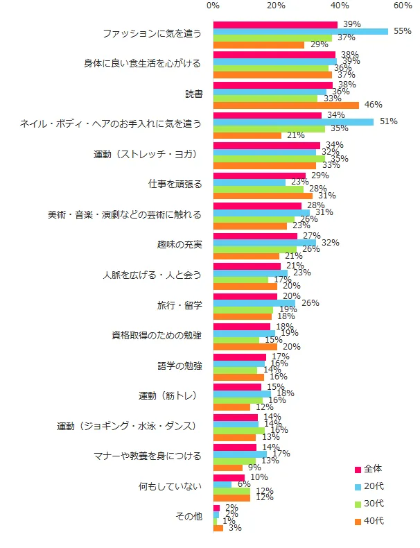 女性の「自分磨き」調査。 自分磨きのトップ3は「ファッション」「食生活」「読書」。 年代別の傾向は?