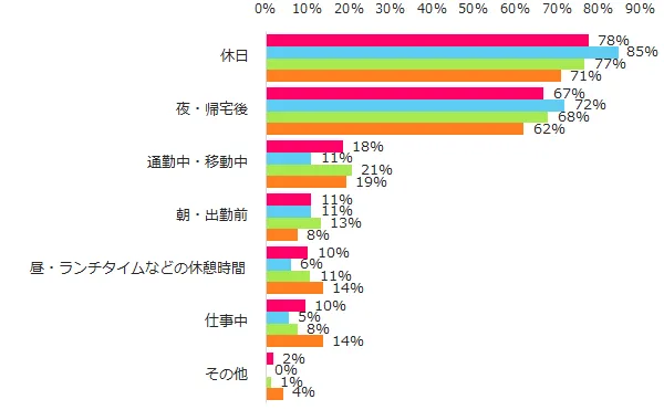 「自分磨き」の時間をいつ取っているか?を伺うと、「休日」(78%)、「夜・帰宅後」(67%)が上位に並びました。