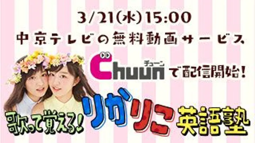 中京テレビ放送株式会社は、双子の女子高生モデル「りかりこ」が考案した、英単語と英文法を“双子ダンス”で覚えられる暗記ソングを2018年3月21日(水)にリリースいたしました。配信開始日には、中京テレビ「キャッチ!」に生出演し、振付を披露し話題となりました。このMVは、中京テレビの無料動画配信サービス「Chuun(チューン)」で限定配信中です。