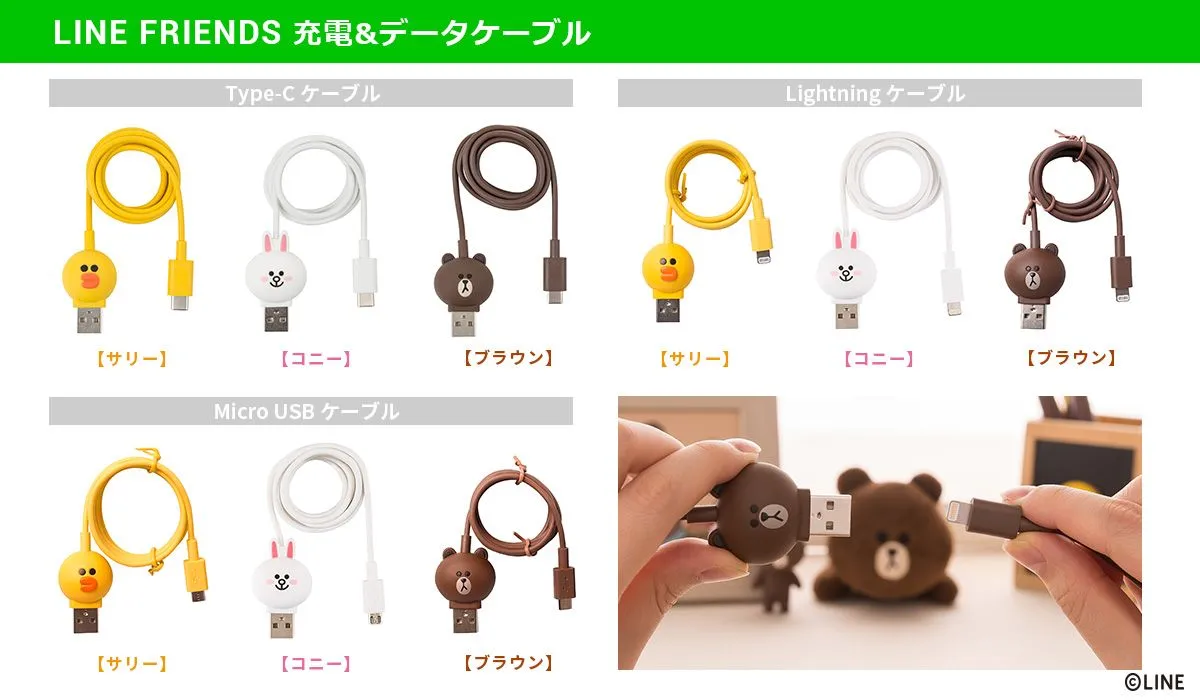 本製品は、「LINE FRIENDS」デザインの充電ケーブルです。人気キャラクターをいつも身近に感じられるデザインが特長で、Type-C、ライトニング、Micro USBの3種類が登場しました。