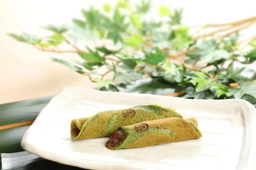 よもぎの香り豊かなクレープ風生地で、特製つぶあんをくるりとロール。お口に入れやすいサイズとクセになるもっちり食感、品のいい甘さと豊かな風味で、新たな京銘菓として期待の一品です。