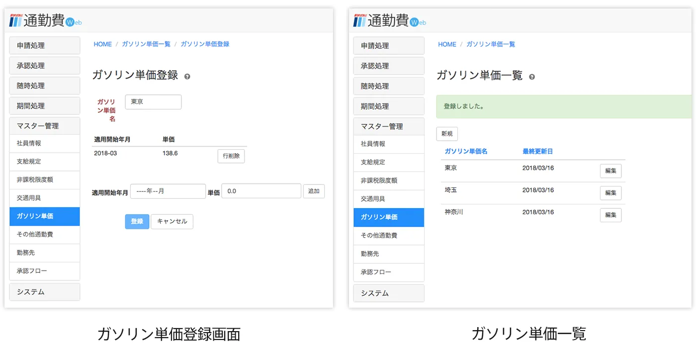 マイカー通勤者がいる企業向けの、ガソリン単価の管理機能です。