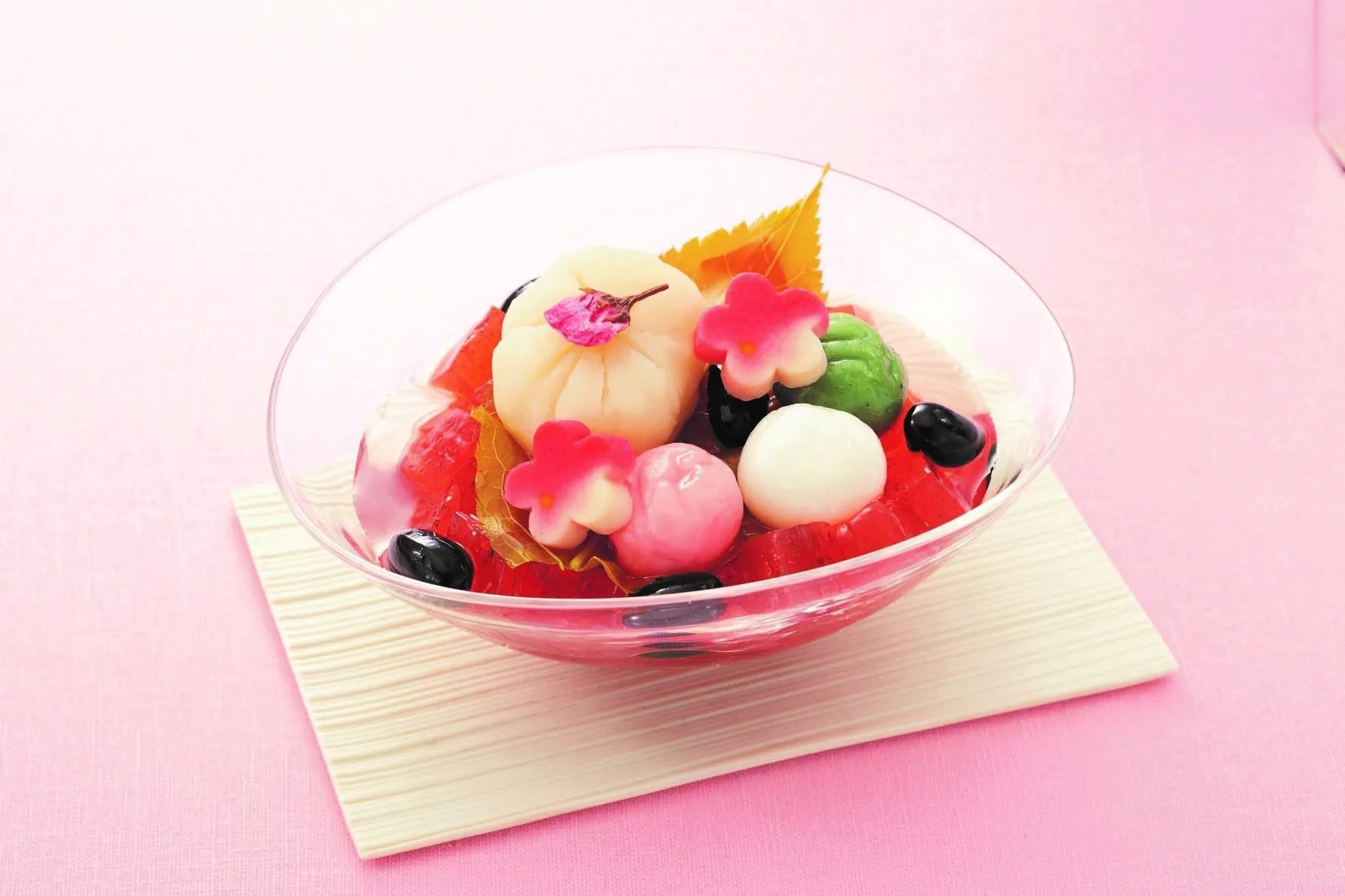 桜寒天に桜葉や白あん、白玉団子、桜麩を添えてほどよくまろやかな甘さになるように調えました。桜の蜜でお召し上がりください。