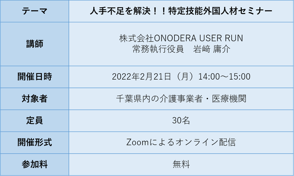 ONODERA GROUPの株式会社ONODERA USER RUN(代表取締役社長:加藤 順 所在地:東京都千代田区(以下OUR)は、株式会社京葉銀行(頭取:熊谷 俊行 所在地:千葉県千葉市中央区)ご協力のもと、2月21日(月)に千葉県内の医療機関・介護事業者に向けて「人手不足を解決!!特定技能外国人材セミナー」を開催することとなりましたので、お知らせいたします。