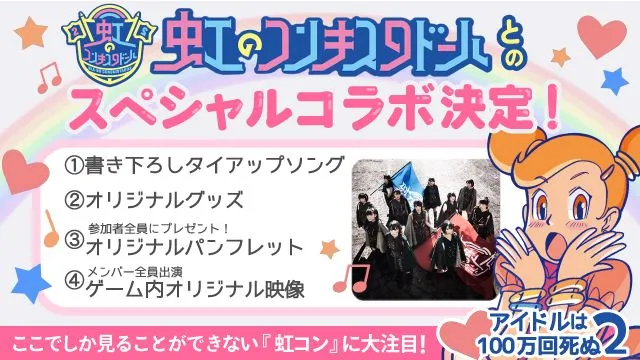 本イベントのために書き下ろしたタイアップソングをはじめ、オリジナルグッズやオリジナルパンフレット、本イベントでしか見ることができない“虹コン”メンバー全員出演のオリジナル映像などスペシャルなコラボが目白押し! 参加者をより一層アイドルの世界へと誘います。