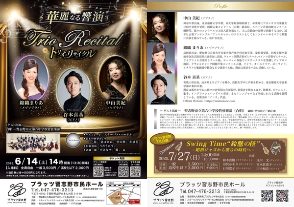 プラッツ習志野でトリオリサイタル開催決定! ゲストに地元 習志野市立第六中学校管弦楽部が出演