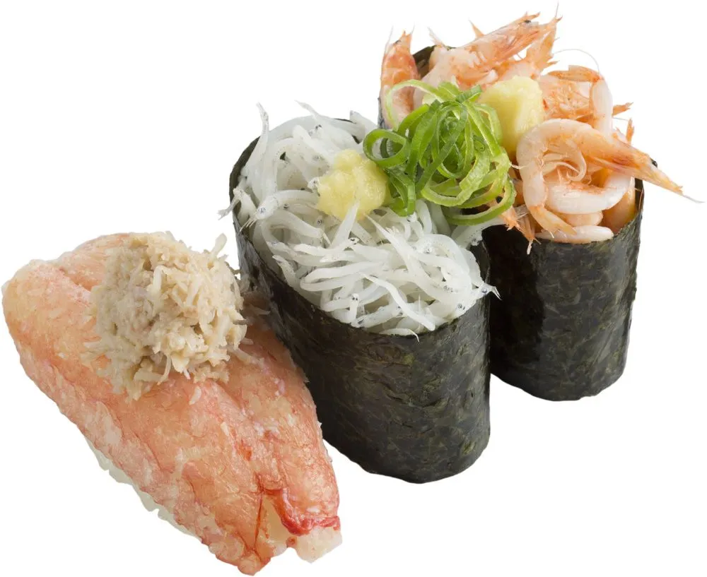 『渡り蟹のカレーまぜそば』/『しらすまぜそば』/『サクサク桜えびまぜそば』3種の開発の元となっているかににぎり・釜揚げしらす・釜揚げ桜えびを一皿で楽しめる『春の贅沢3貫盛り』が同時販売。春の彩り豊かな海の幸をまとめてお召し上がりいただけます。