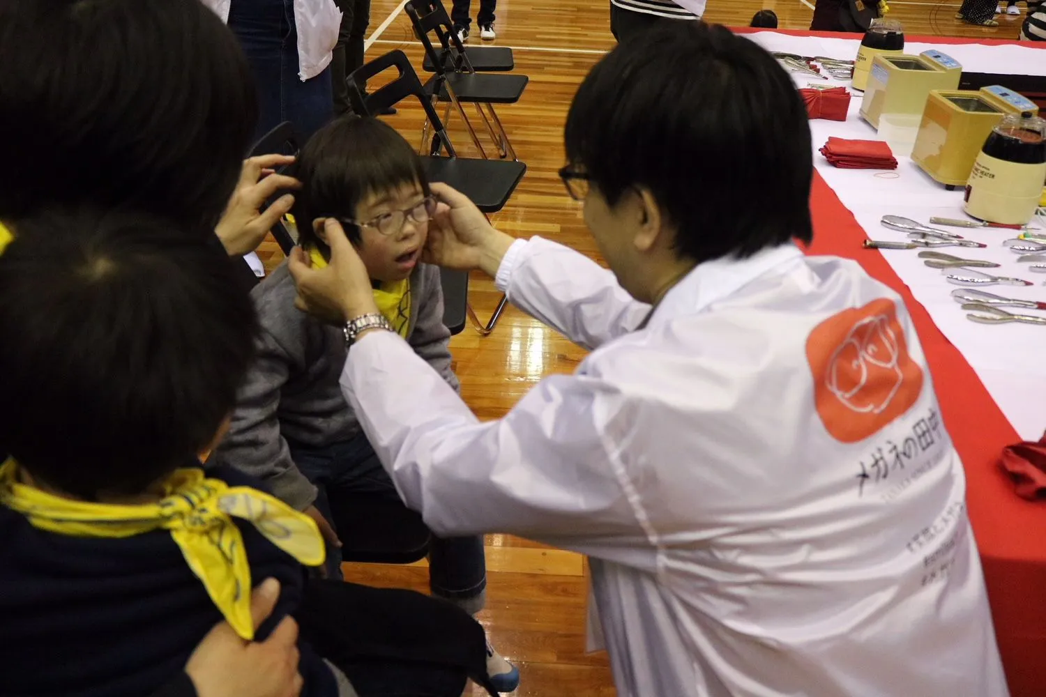 また、広島グリーンアリーナでは、メガネのある生活をより快適に楽しんでいただきたいという想いから、メガネに関する無料相談会を実施。ダウン症のあるお子様に負担なくかけていただけるメガネのご紹介や、正しい位置でメガネをかけていただくためのフィッティングを当社のスタッフが行い、お子様方も非常に嬉しそうな様子を見せていらっしゃいました。