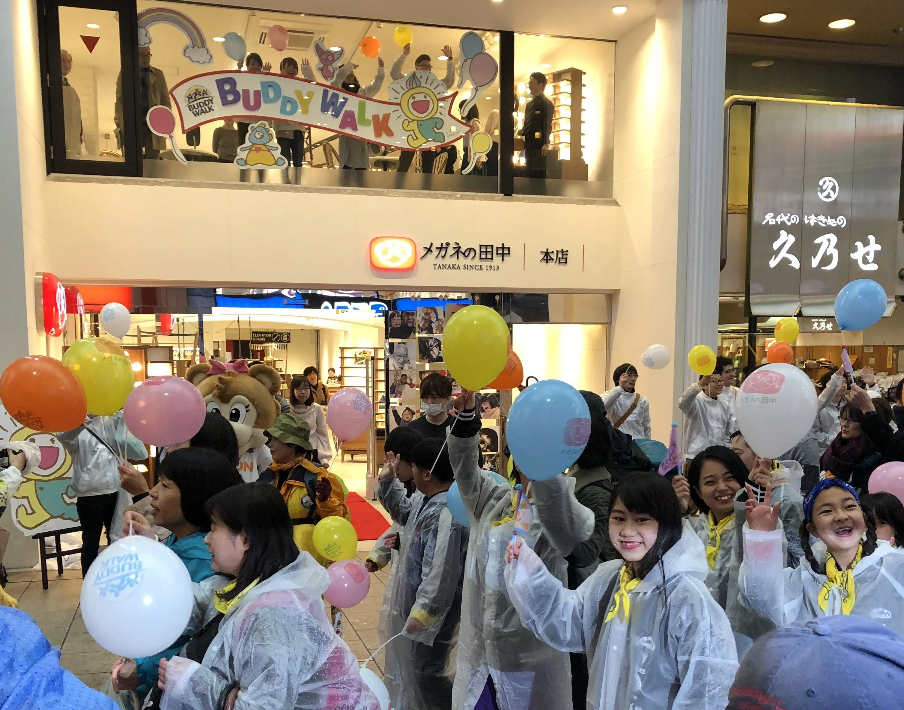 バディウォークでは、メガネの田中本店も位置する本通り商店街を総勢360名が大行進し、当社社員約60名も参加いたしました。ダウン症のあるお子様をはじめとする参加者の笑顔溢れる姿が大変印象的でした。本店前では、『メガネの田中スマイル・アクト』プロジェクトで投稿いただいた笑顔とメガネの写真をレコードジャケットにレイアウトした装飾で店頭を彩るとともに、当社スタッフが皆様を出迎え、声援を送りました。