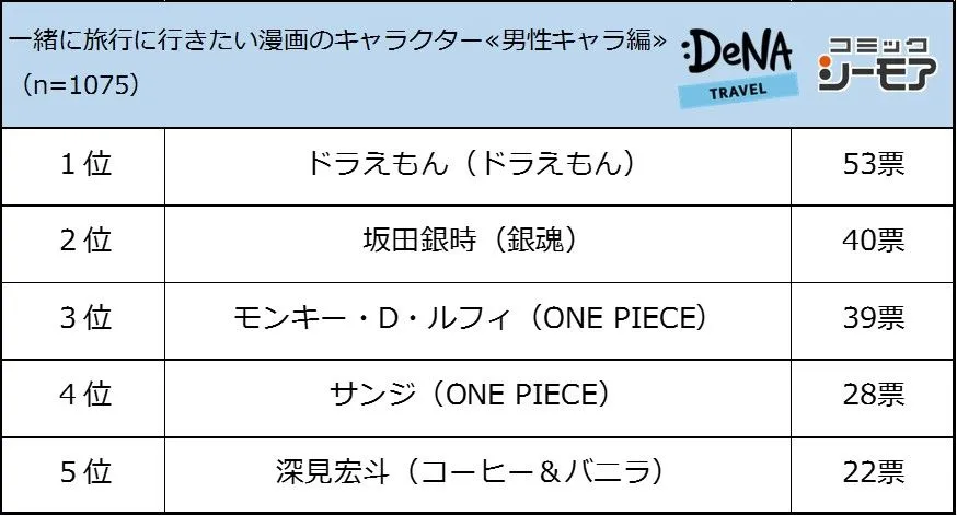 一緒に旅行に行きたい漫画のキャラクターを男女別のキャラで集計した結果、男性キャラの1位は「ドラえもん(ドラえもん)」(53票)となりました。「どこでもドア」をはじめとしたひみつ道具で様々な場所や時代を一緒に旅行できるというのが人気の理由でした。その後、「坂田銀時(銀魂)」(40票)、「モンキー・D・ルフィ(ONE PIECE)」(39票)、「サンジ(ONE PIECE)」(28票)、「深見宏斗(コーヒー&バニラ)」(22票)と続いています。