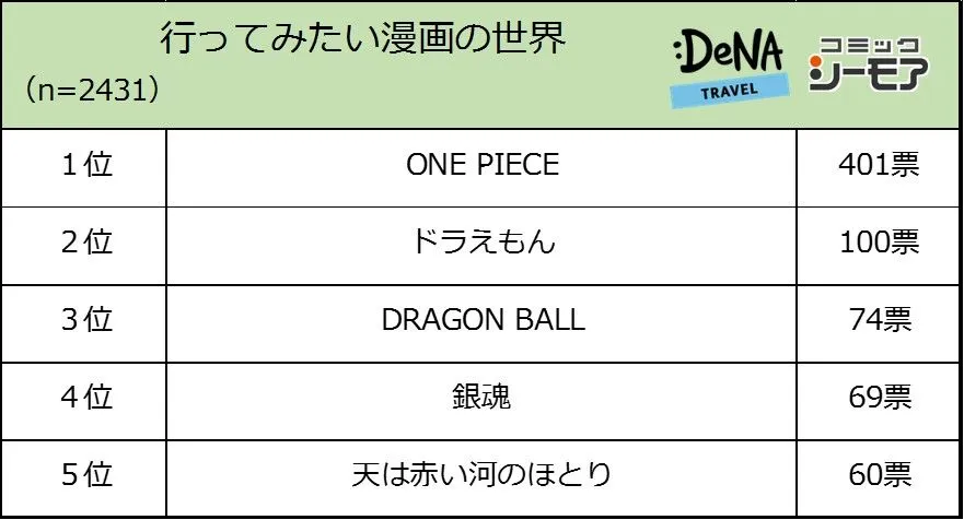 行ってみたい漫画の世界トップ3は「ONE PIECE」(401票)、「ドラえもん」(100票)、「DRAGON BALL」(74票)となりました。